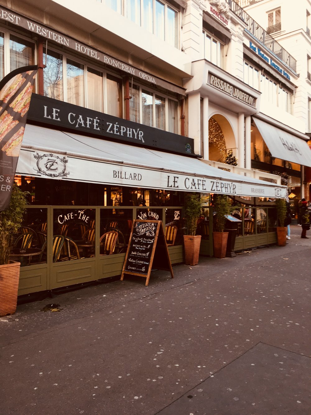 Unfortunately, the hotel is not wheelchair friendly however, the Hotel Ronceray also in passage Jouffroy can accommodate wheelchair users. As we were there for only a night, we decided to eat at the café just outside passage Jouffroy, le café Zéphyr which has all-day dining and serves a delicious breakfast starting at 8 euros. It’s a typical Parisian café with those familiar and iconic checkered chairs, outdoor heating even offering blankets to keep the chill at bay which we didn’t need to use when we visited at the end of March. It was just lovely to sit here for an hour or so after sight seeing enjoying a beer and a glass of wine. Many of the bars and cafés along Boulevard Montmartre have Happy Hours between 5:00pm-7:00pm where drinks and cocktails are 50% cheaper.