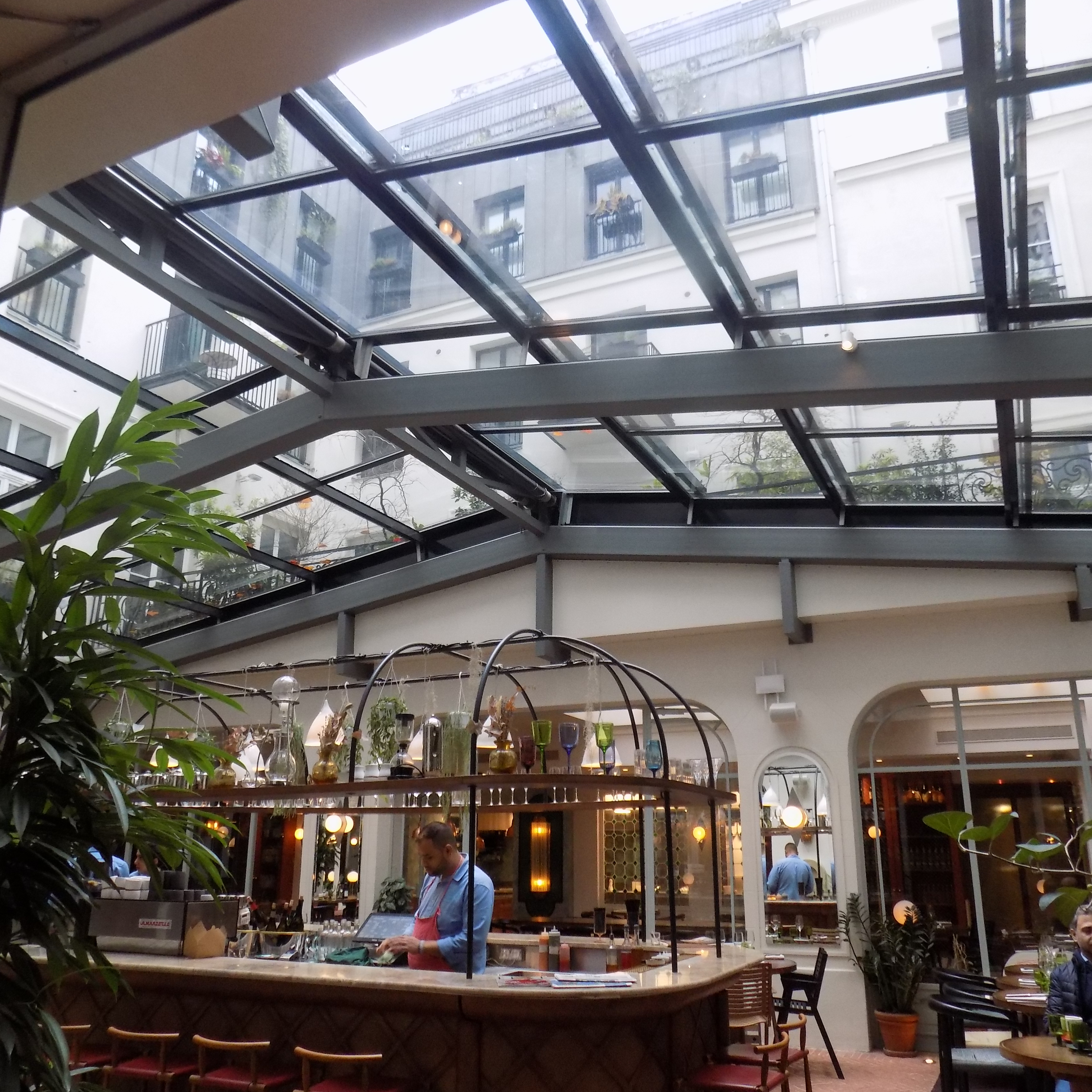 Later in the evening, we look forward to drinks at the Shell Bar, a special invitation by the hotel as it’s my husband’s birthday, we are kindly complimented with two cocktails. The Shell Bar has a very subterranean feel, it’s warm and inviting and although a bit small, it’s cosy and vibrant and guests from outside can book ahead for drinks and dinner in the beautiful courtyard which looks completely different in the evening festooned with fairy lights. I’m reliably informed that the hotel has many outside visitors both at the bar and at the restaurant. We had a dinner reservation at one of Paris’ most popular and hard-to-get-into bistro’s, L’Ami Jean after drinks which was incredible, more on that in a later review.
